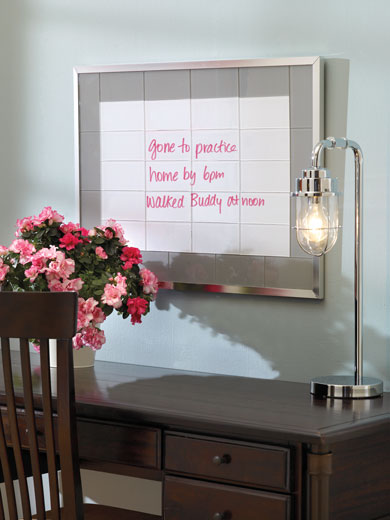 Glass tile message boards have surfaced at the latest design shows. Score this hot trend with Home's new peel and stick glass tiles and dry erase markers. Fast, easy, and fabulous.