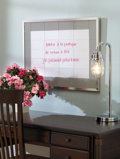 Les babillards en carreaux de verre sont l'une des dernières tendances des salons du design. Installez-en chez vous en vous servant des nouveaux carreaux de verre autocollants de Home, puis écrivez dessus à l'aide de marqueurs à essuyage à sec. Rapide, facile, magnifique!